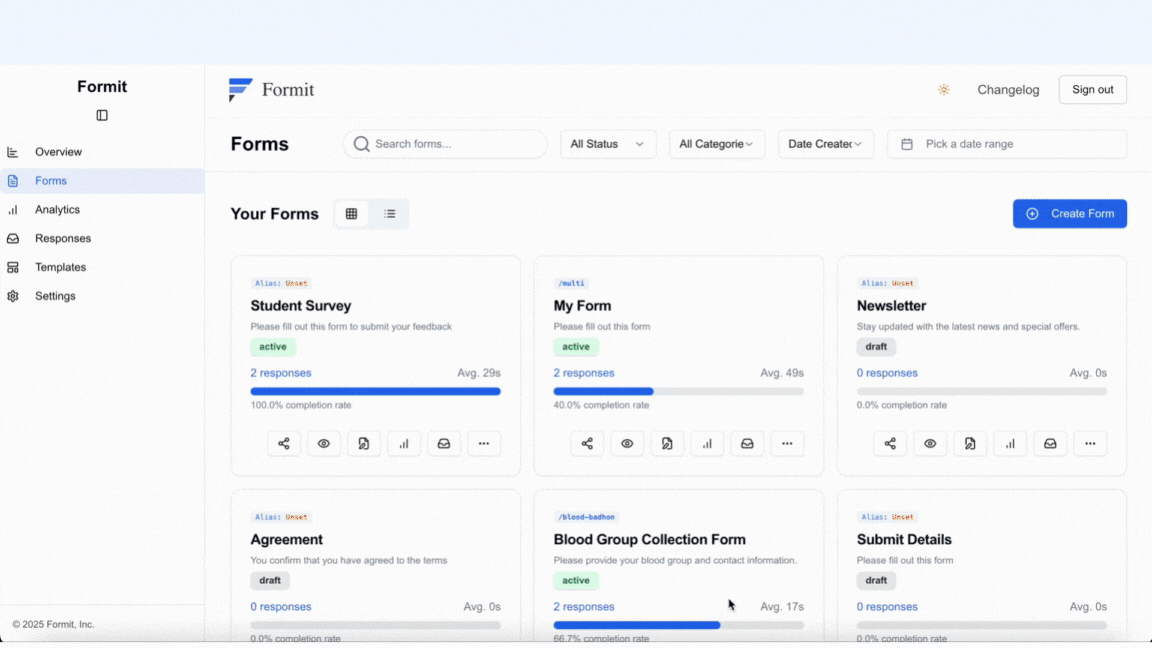 Watch submissions arrive in real time, see where people drop off, and export full response history on Pro.